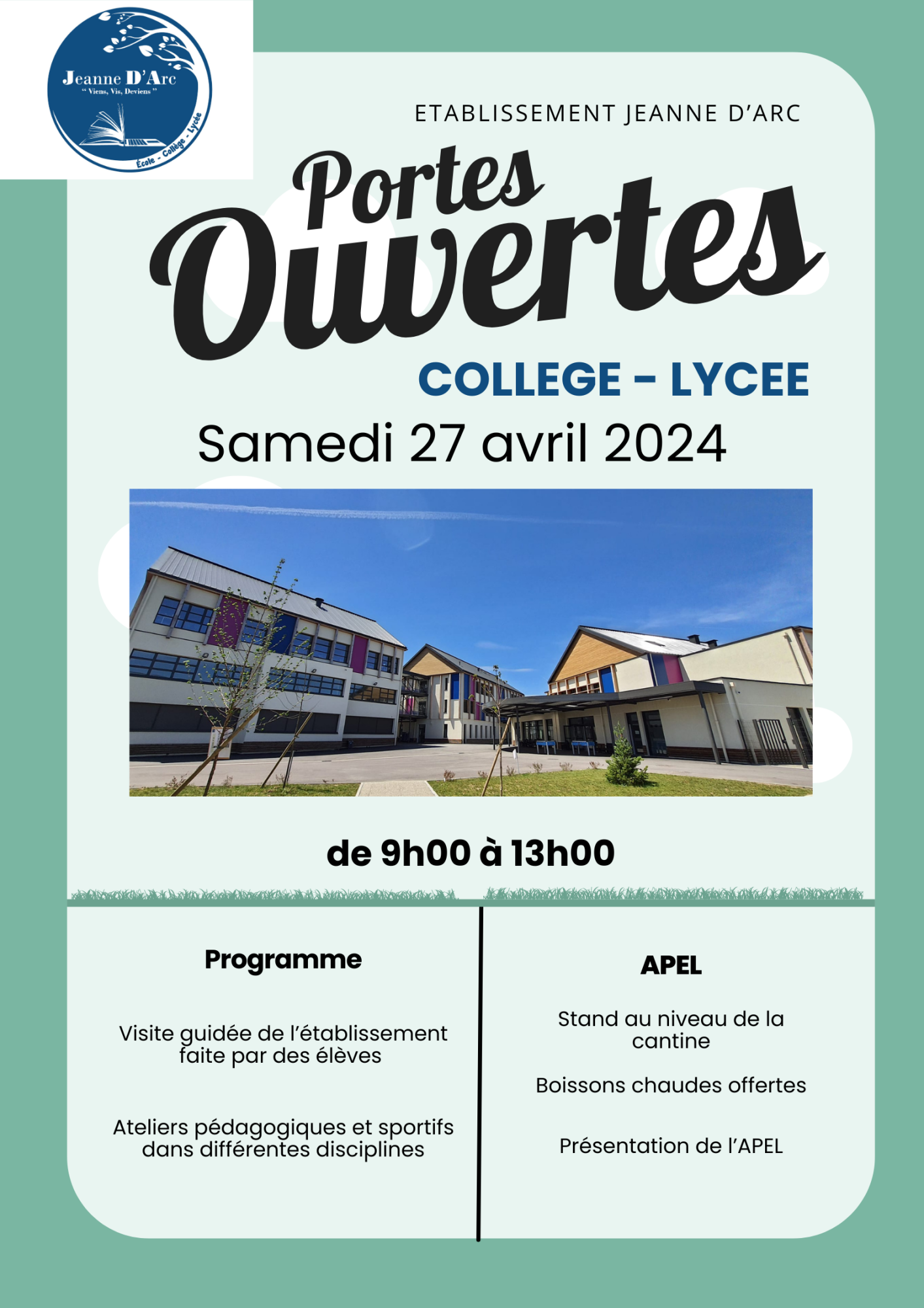 L’établissement Catholique Jeanne d’Arc est un groupe scolaire sous tutelle diocésaine et sous contrat d’association avec l’Etat, qui, ouvert à tous, accueille les jeunes de la maternelle à la terminale.